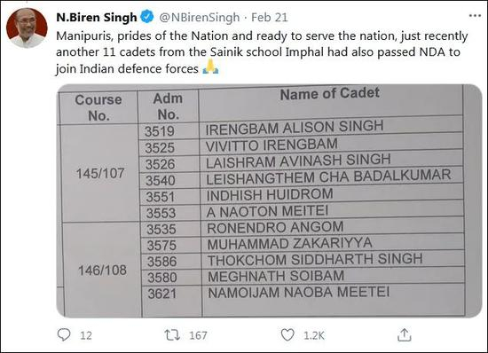 值得注意的是,辛格21日在推特上发了一张名单,上面列着11名印军新兵的名字,他们都来自曼尼普尔邦。辛格写道:“曼尼普尔人是国家的骄傲,随时准备为国家服务。”