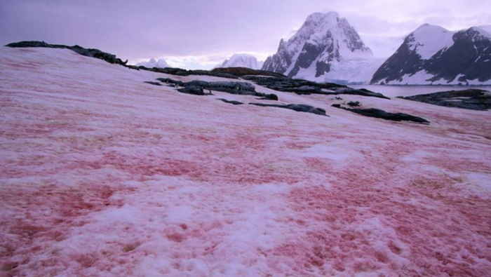 由于气候暖化,南极及欧洲阿尔卑斯山脉出现了因藻类生长导致的粉色冰川,再次为人们敲响警钟。