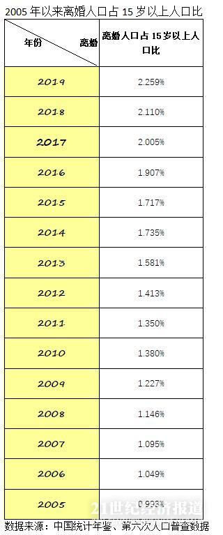 中国统计年鉴显示,2005年,我国离婚人口占15岁以上总人口比例为0.993%,随后14年,这一数据仅在2011年出现小幅下降(原因可能是2010年人口普查的数据更为全面,而抽查中有一定误差)。2019年,我国离婚人口占15岁以上总人口比例达到了2.259%,这一数据较2005年涨幅达到127%。