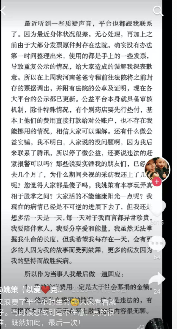 姚策还表示,网友的私人捐款,“只要你用自己的私人账号联系我,附上截图,我一定会退”。不过,有网友表示有爱心网友发了截图转账,未见其转回。