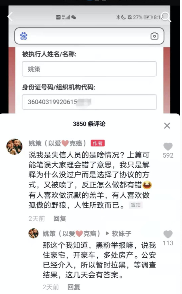 2月24日,针对有人质疑姚策被列为失信执行人,他又发布了一条抖音回应。