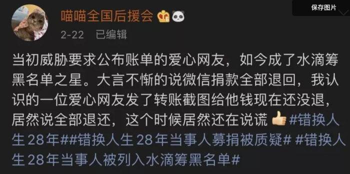 2月23日,他再次回应表示对于捐款情况,“我无法一一核实,但是存在问题的,我会退还平台,由平台进行核实,这个大家都放心,跑不掉的”。