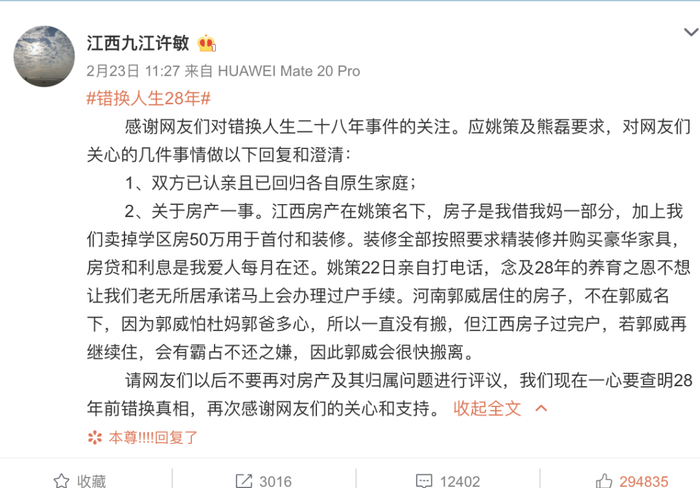 “错换”改为“偷换”,一个字的差别让网友们猜测不断。还有网友爆出,姚策因多平台筹款被纳入水滴筹、轻松筹黑名单,当年接产护士郭希志和姚策生父郭希宽疑为兄妹关系,此案再度引发舆论关注。 姚策养母许敏发文求真相 2月19日起,微博用户名@江西九江许敏 不间断地推送《错换人生28年始末》一文,文章中细述了自己十月怀胎以及到河南开封生孩子的事情。