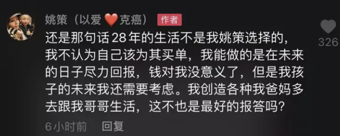 对于两家人的矛盾,许敏表示:“姚策是很无辜的,我不能眼睁睁看他最后还带着这种遗憾,这个真相查出来也是很残忍的。”昨日晚间,姚策再次在抖音进行了“坐等真相,反对诬陷”的回应,称风口转向了自己亲生父母这边,认为是李胜律师在直播中说的话让大家产生了误解。