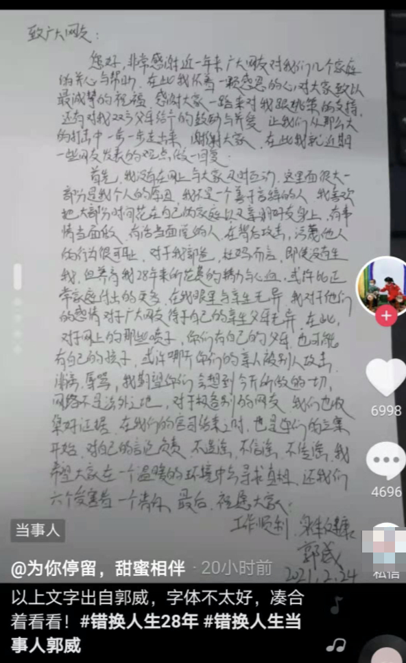 而许敏的亲生儿子郭威也在抖音发布亲笔信,言辞之中是对养父母郭杜夫妇的偏袒,称养父母养育自己多年不易,和亲生父母无异。对于自己的亲生父母并未涉及。