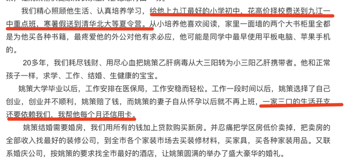 “1992年6月15日凌晨,我感觉到肚子一阵疼痛,因为头胎没有经验以为马上生了就赶紧往医院跑。进产房不久,我顺产生下1名7斤重的男婴。。。。。。。郭威生出来是3500克,姚策出生只有3200克。岀院时,护士将我们准备的衣服包被裹着的宝宝给我爱人,我们夫妇抱着脸上有红点的孩子离开了医院。我们特别信任医院,这是在河南省都非常有名的医院,却没想到我十月怀胎痛了一整天才生下来的孩子竟然被换了。”许敏回忆了自己养育姚策的艰辛、委屈和付出,“ 到了二岁半,姚策准备上九江最好的市委幼儿园,在入园体检时,却查出了有乙肝病毒。当时全家十分恐慌,不知这病毒从何而来,我们夫妻身体健康,家族也没有乙肝病史。母亲责怪我没照顾好宝宝,怀疑是去免疫接种时被传染的。我自责不已,专门请一年长假全身心照顾姚策,后来还从爱人老家请来亲戚在家里照顾着姚策”。为了治疗姚策的乙肝,全家人去到北京、上海、南昌、河南等地找最好的专家寻医问药。在许敏夫妇工资只有几百元的时候,却为姚策治疗花费上千元的药物,“除了我们夫妻的收入,我父亲的工资也都给了我,只怕委屈了姚策,让姚策愉快健康成长家里人都愿意付出一切。。。。。。。20多年,我们耗尽钱财、用尽心血把姚策乙肝病毒从大三阳转为小三阳乙肝携带者。他和正常孩子一样,求学、工作、结婚、生健康的宝宝”。