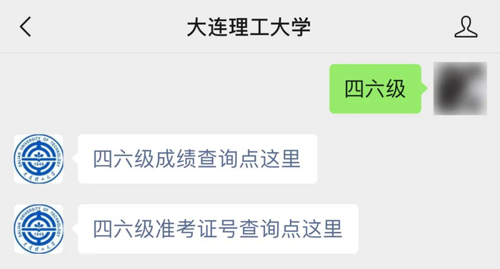 关注大连理工大学微信公众号,发送“四六级”或“CET”,后台将自动回复四六级查分地址,输入准考证号和姓名即可查询。