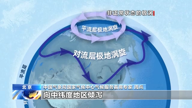 中国气象局国家气候中心气候服务首席专家 周兵:极涡是一直存在的,就是在冬季时,有大量的冷气团堆积在北极圈附近,当这个系统偏离极区的位置时,就会导致大范围的冷气团向中纬度地区倾泻。在1月上旬左右,极涡的位置偏向东半球,所以在1月份上旬到中旬,我国经历了多次寒潮过程。今年2月份极涡的位置偏向西半球,在北美附近就是一个深厚的槽,带动极地的冷气团向南倾泻,强度比较强,一直影响到了得克萨斯州,甚至墨西哥。