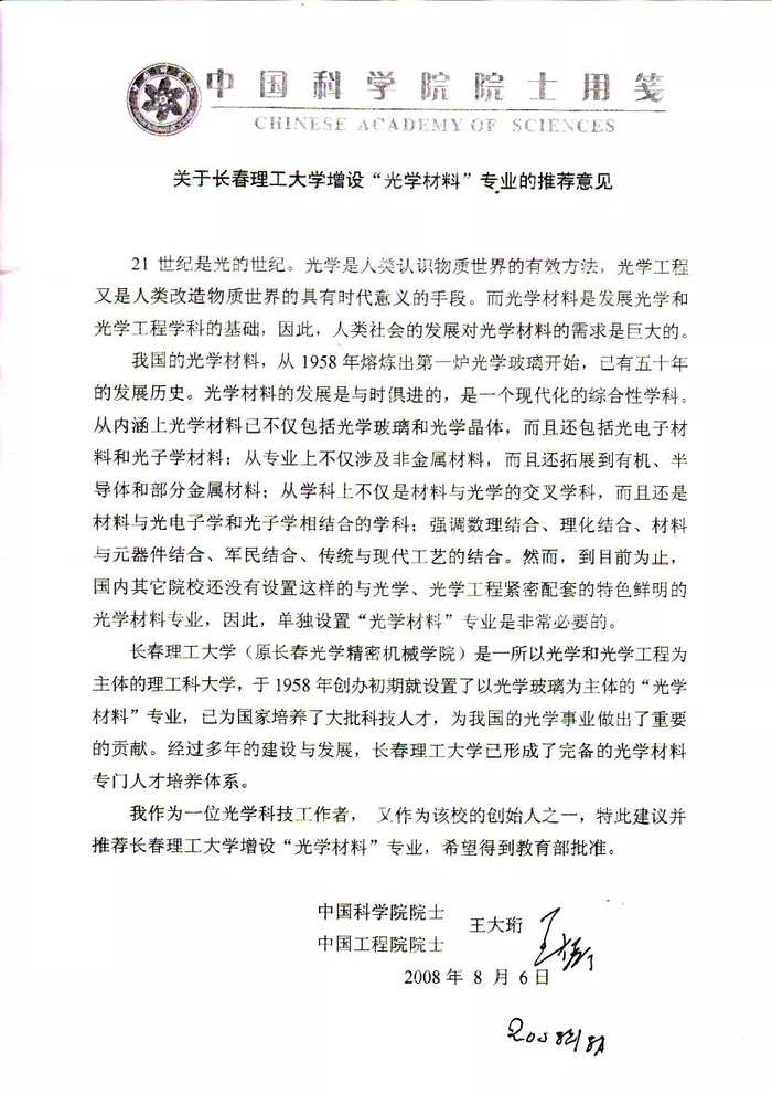 2008年,王大珩致函教育部推荐学校增设“光学材料”专业