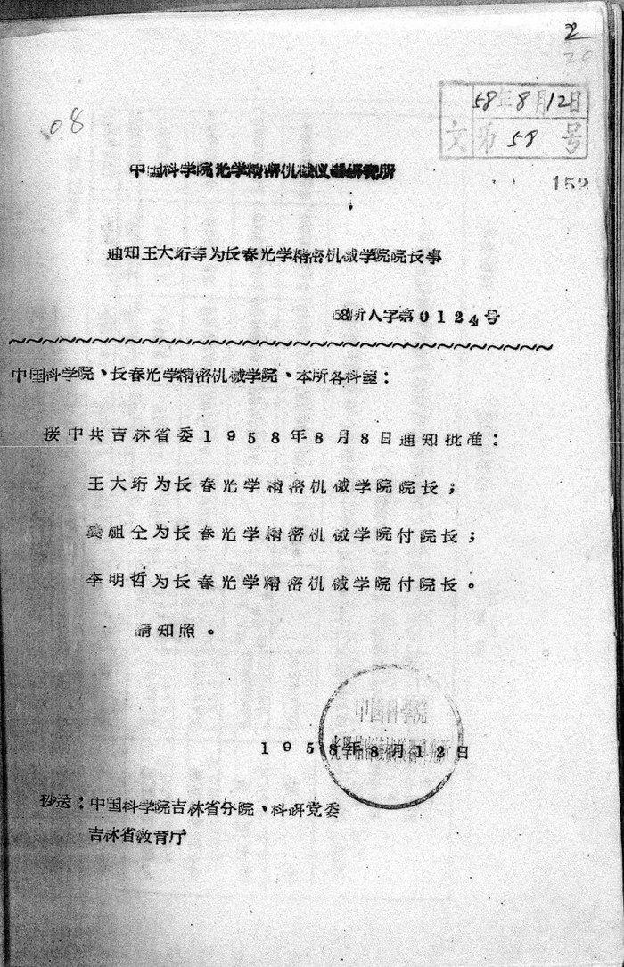 1958年,任命王大珩为长春光学精密机械学院院长文件