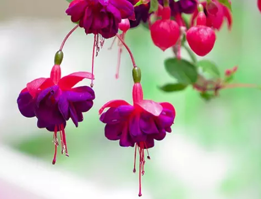 倒挂金钟别名吊钟海棠。开花时,垂花朵朵,婀娜多姿,如悬挂的彩色灯笼,盆栽适用于客室、花架、案头点缀,用清水插瓶,既可观赏,又可生根繁殖。