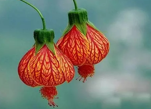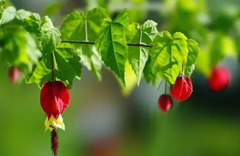 悬风铃花又称蔓性风铃花、红萼苘麻。花朵下垂,有细长的花梗,红色的萼片包裹着闭合的黄色花瓣,而伸出的棕色花蕊则像灯笼的穗子。整个花朵好似一个个色彩娇艳、自然别致的“拇指”小灯笼,煞是好看。