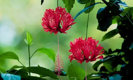 吊灯扶桑又被称为风铃扶桑、吊灯花,是热带各国常见的园林观赏植物;耐修剪,也是常见的绿篱植物。它的花蕊下垂,花瓣翻卷,像极了一盏精致的吊灯,异常美丽。
