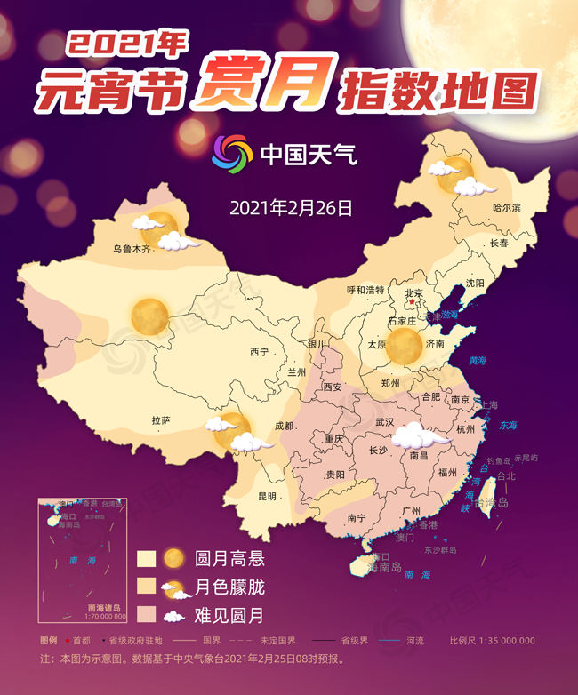 根据预报,元宵节(2月26日)当晚,浙江、上海、安徽中南部、江苏中南部等地因为降水或云层较厚,无缘明月。