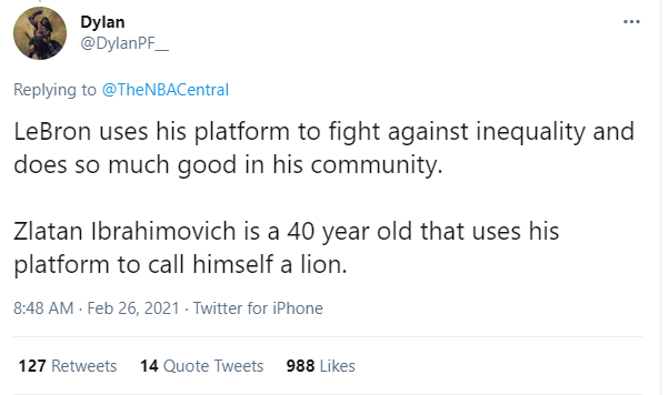 从这些网民的评论来看,他们认为身为黑人的詹姆斯,是在通过自己的影响力和NBA这个平台推动美国社会的进步,在努力与社会中的不平等做斗争,帮助了很多人——反倒是身为白人的伊布,只是在利用自己的名声和足球场这个平台炒作自己,并认为伊布最好在这种事情上“闭嘴”。
