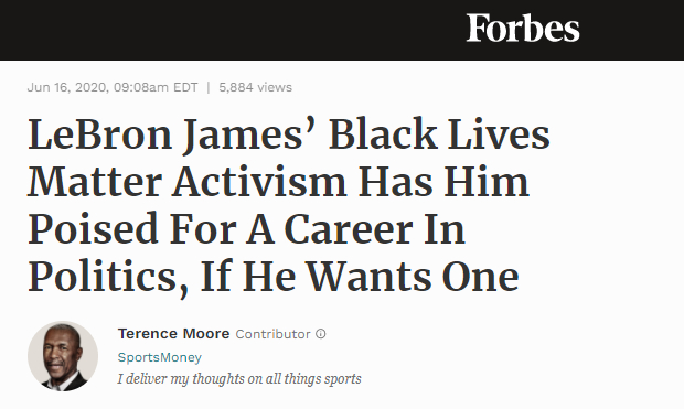 有美国媒体还曾专门撰文分析詹姆斯对于种族主义这种政治话题的热衷,称詹姆斯已经为自己打开了一条从政的职业大门。