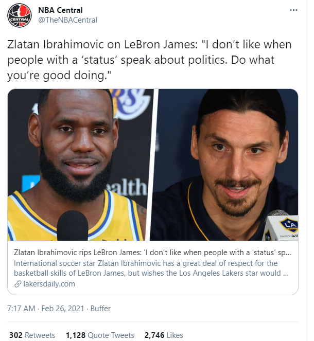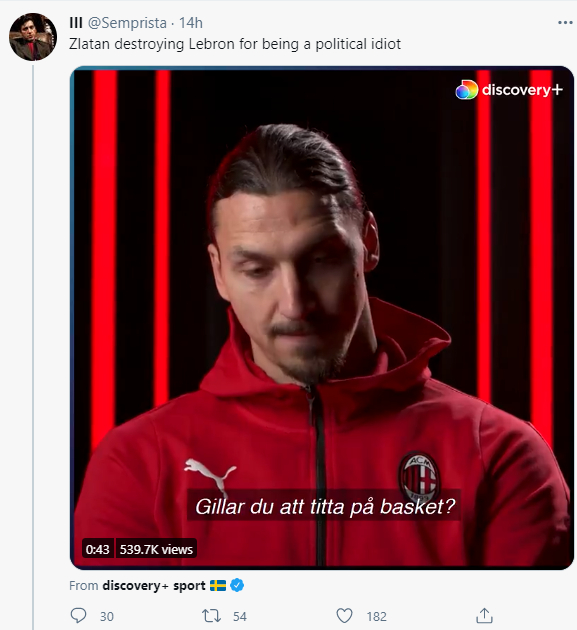如上面这段视频所示,在被问及如何看待美国NBA著名球星詹姆斯时,伊布虽然表示自己很欣赏詹姆斯的球技,但他突然话锋一转,说“我不喜欢当人们有了一定的‘地位‘后,他们一边打球一边却又搞起了政治”。
