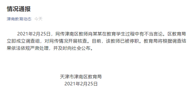 津南区教育局通报称,该教师已被停职,教育局将根据调查结果依法依规严肃处理,并及时向社会公布。