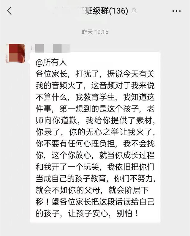 她说,“就当你成长过程和我开了个玩笑,我依旧把你们当成自己的孩子教育,你们不努力,就会不如你的父母,就会阶层下移!望各位家长把这段话读给自己的孩子,让孩子安心,别怕!”