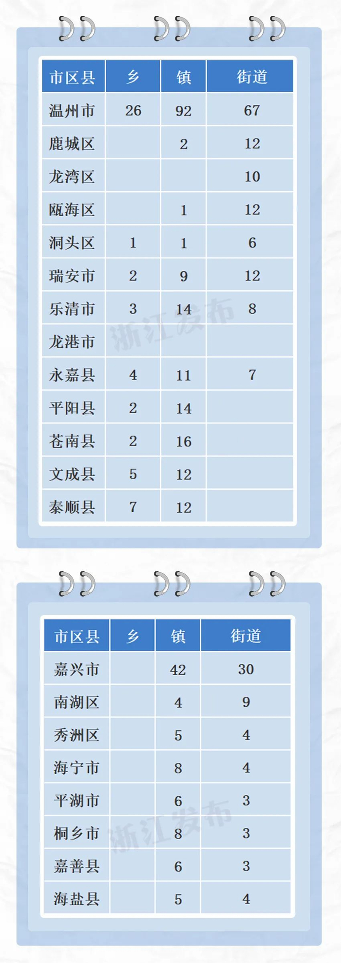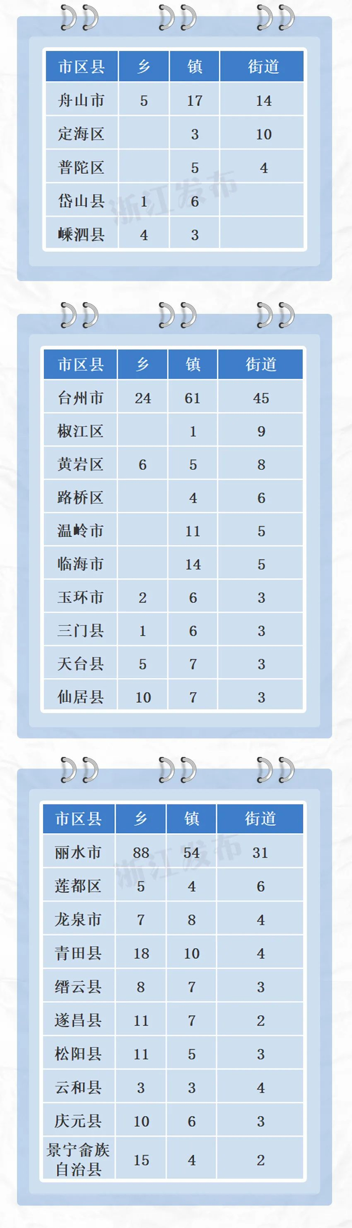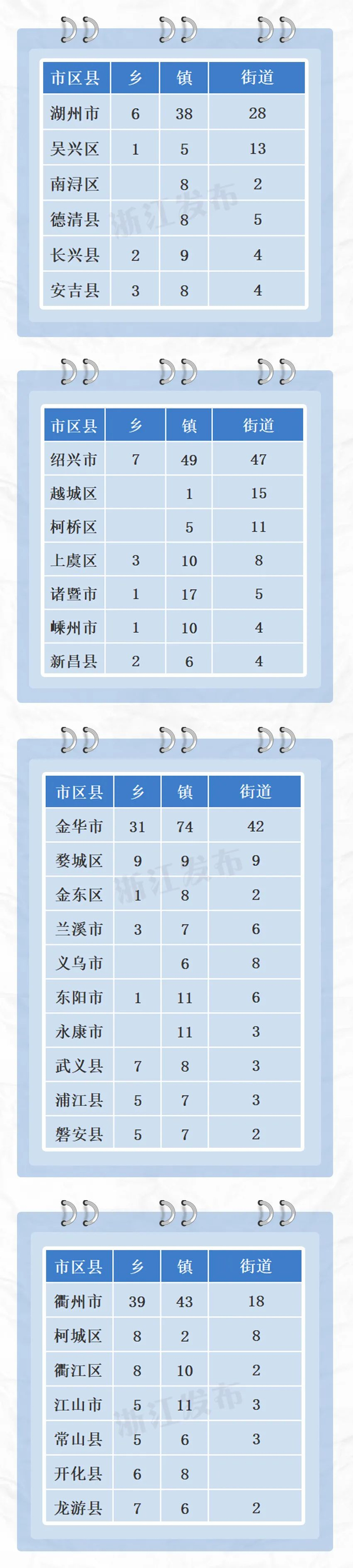2020年,浙江部分行政区划发生了调整。据省民政厅统计,目前全省共有11个地级市、37个市辖区、20个县级市、33个县(其中1个自治县)、259 个乡、618个镇以及488个街道。具体变化情况↓↓