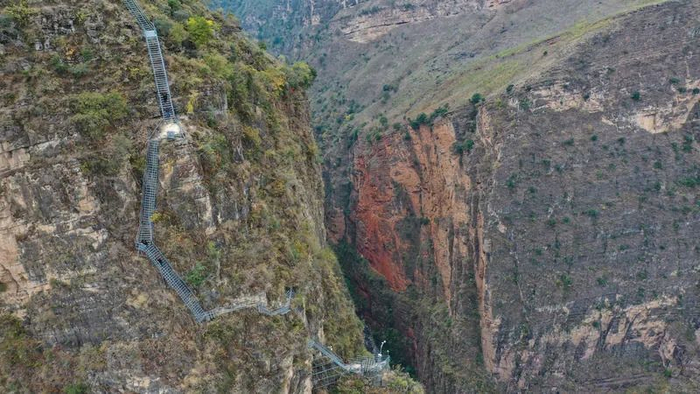 在四川省凉山彝族自治州昭觉县支尔莫乡阿土列尔村,某色拉博下钢梯,准备去接一名游客(2019年11月24日摄)。新华社记者 江宏景 摄