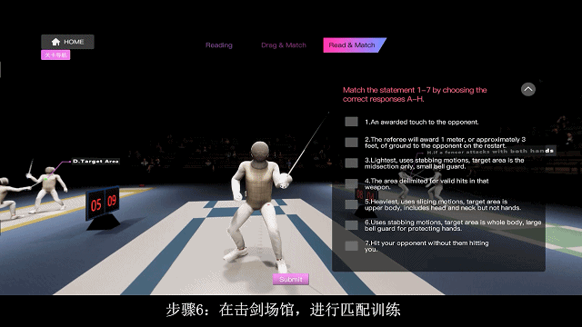 在第二关的击剑俱乐部里,你可以体验VR换装,自主操控进行场景交互并熟悉击剑比赛穿戴要求。此外还要认识击剑比赛用剑类别。准备好后,就可以上场比赛了。( 是不是有点西部世界的感觉?)