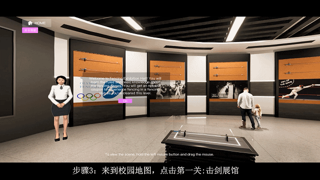 这个仿真实验项目里的击剑热身场馆、校园均为实拍图,目的是让场景更加逼真,每一个画面都高度还原。