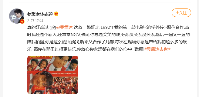 林志颖发文:“真的好难过,达叔一路好走,1992年我的第一部电影《逃学外传》跟你合作,当时我还是个新人,还常常NG又卡词,你总是笑笑的跟我说:没关系没关系,然后一遍又一遍的陪我拍摄,你是这么的照顾我,后来又合作了几部,每次在现场你总是带给我们这么多的欢乐,愿你在那里过得更快乐,你放心你永远都在我们的心中。”