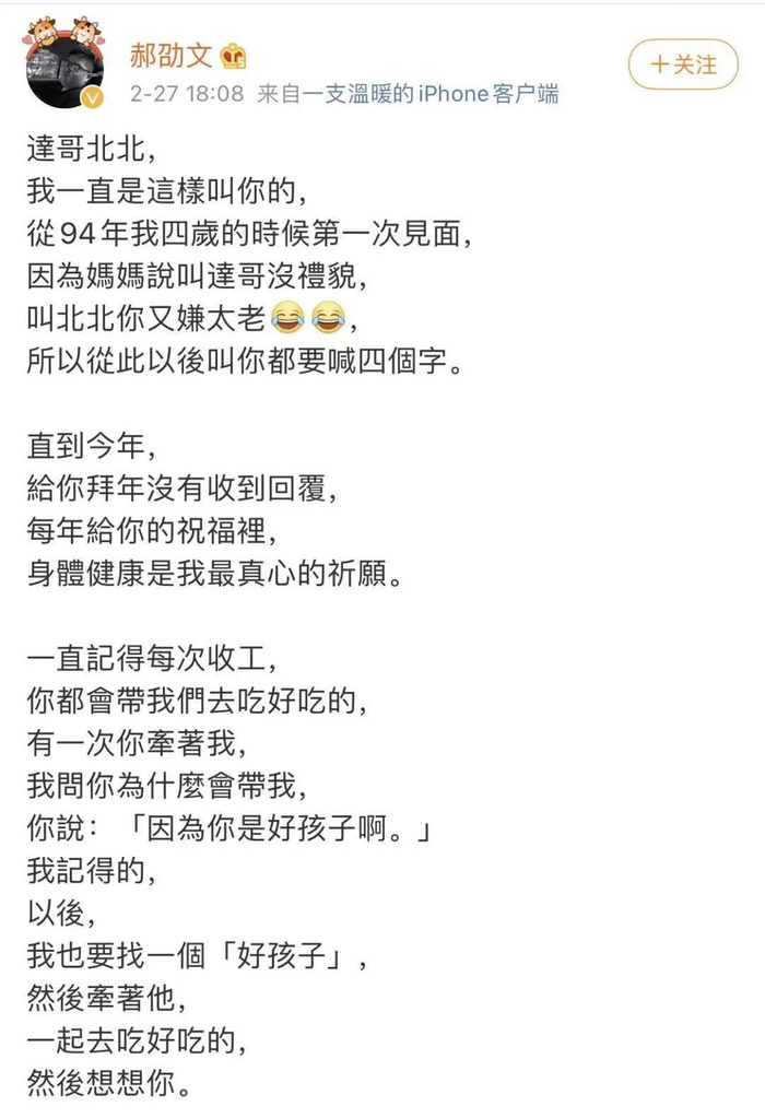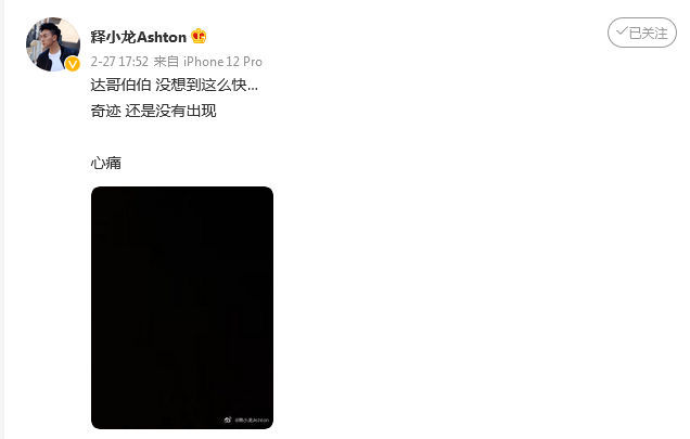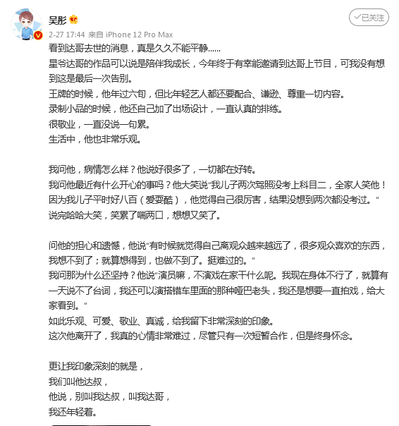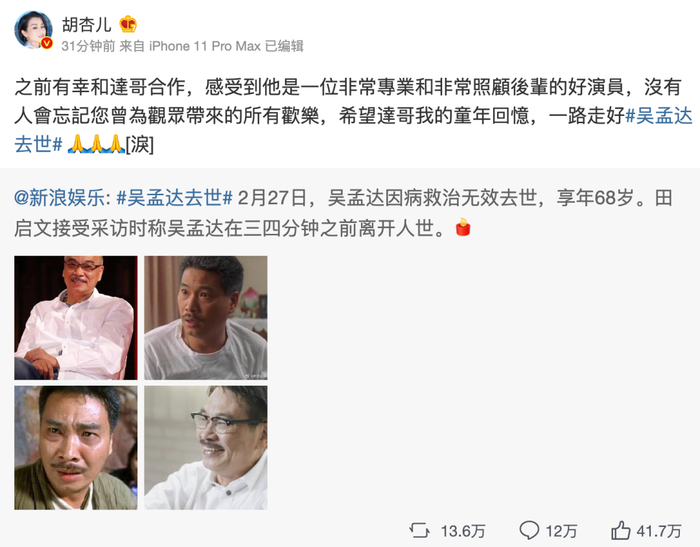 胡杏儿发文称:“之前有幸和达哥合作,感受到他是一位非常专业和非常照顾后辈的好演员,没有人会忘记您曾为观众带来的所有欢乐,希望达哥我的童年回忆,一路走好”