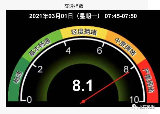 开学首日早高峰,赶上雨雪天气,路面交通压力大。不到8时,北京全路网交通指数8.1,进入严重拥堵级别。