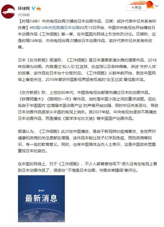 #时隔14年央视再播日本动画#2月13日开始,中国中央电视台开始播放日本动画作品《工作细胞》第一季,在中国国内网络上引发热烈讨论。日媒称,这是时隔14年后,中央电视台再次播放日本动画作品,或许代表中日关系有所改善。
