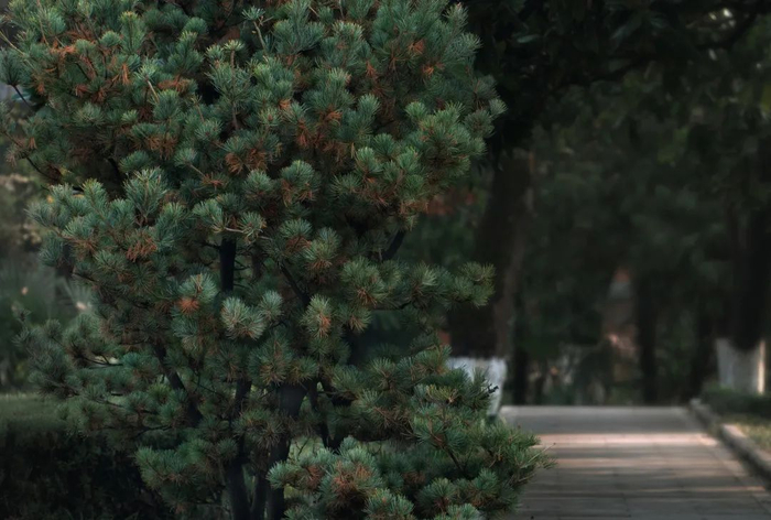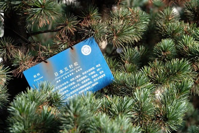 五针松一般指日本五针松,原产于日本,在引进中国后深受人们喜欢。五针松干苍枝劲,翠叶葱笼,秀枝舒展,偃盖如画,诚集松类气、骨色、神之大成,是难得的园林珍品。若在校园里偶遇一株五针松时,可以稍作停留,仔细观赏一番。