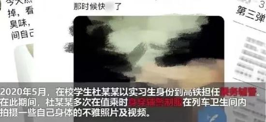 中央政法委长安剑微信公号3月1日消息,近日,据相关媒体爆料,在校学生杜某某以实习生身份到高铁担任乘务辅警期间,多次在值警时,身穿辅警制服到列车卫生间内拍摄自己的不雅照片和视频,并且上传到境外社交软件上,点击量破万。经北京铁路运输检察院提起公诉,被告人杜某某因传播淫秽物品,被判处5个月拘役。