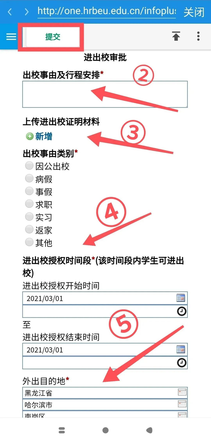 ① 进出校审批需提前两天提交申请。(例如:计划3月5日返校,须在3月3日完成提交。)