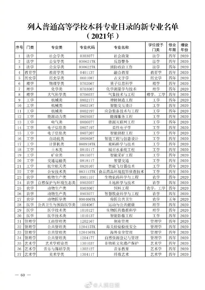 ☞ 教育部:高校本科专业目录新增37个新专业