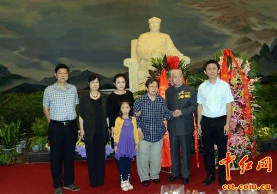 ·2015年9月9日,王景清(右二)、李讷(右三)、李讷之子王效芝(右一)、毛泽东侄女毛小青(左二)等在毛主席纪念堂大厅的毛主席塑像前合影留念。(中红网江山摄)