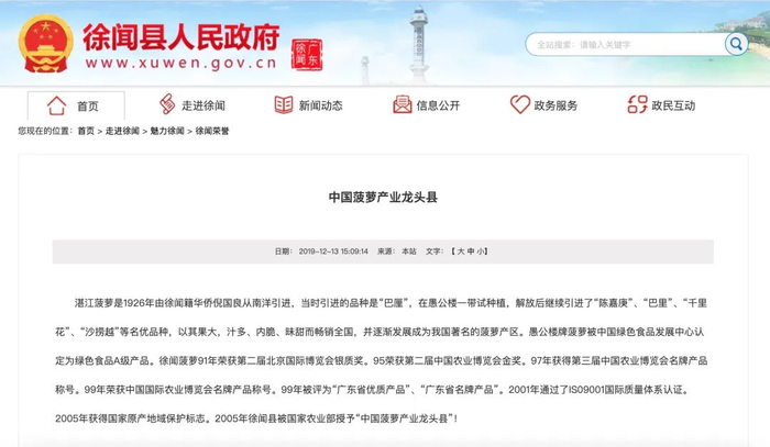 而据广东省徐闻县政府官网以及中国农业农村部官网介绍称,2005年徐闻菠萝获得国家原产地域保护标志,徐闻县也于当年被国家农业部授予“中国菠萝产业龙头县”的称号。徐闻菠萝是1926年由徐闻籍华侨倪国良从南洋引进,当时引进的品种是“巴厘”,在愚公楼一带试种植,解放后继续引进了“陈嘉庚”、“巴里”、“千里花”、“沙捞越”等名优品种,以其果大,汁多、内脆、昧甜而畅销全国,并逐渐发展成为我国著名的菠萝产区。