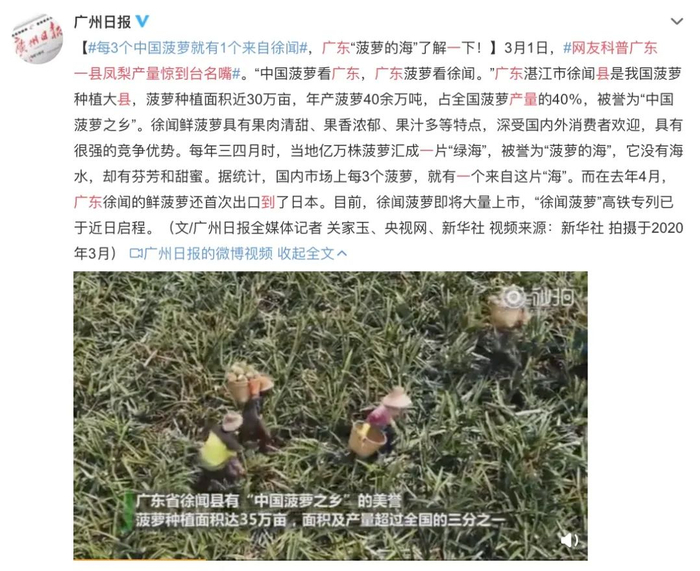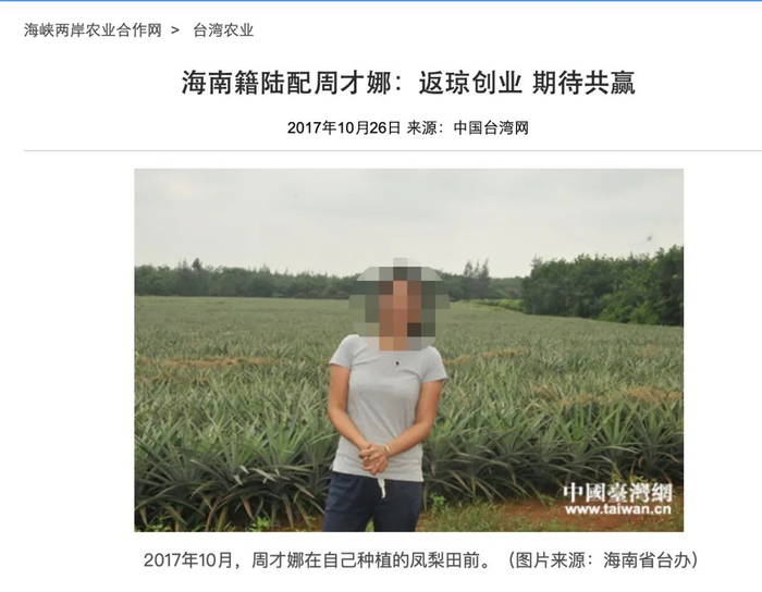 发文的台湾网民根据2017年发布于“海峡两岸农业合作网”的一篇文章进行“人肉搜索”称,一名嫁到台湾的名叫周才娜的海南籍女子,和她的丈夫、台湾籍人士蔡旭升因为引进台湾的种植技术、品种和管理经验,回海南种植金钻凤梨而被列为“返乡创业”的模范。