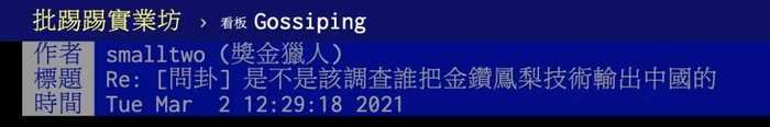 随后有台湾网民在台湾省知名社交平台上发文称“是不是该调查谁把金钻凤梨技术输出中国的”,台湾网民也就此开展了热烈的讨论和广泛的调查。
