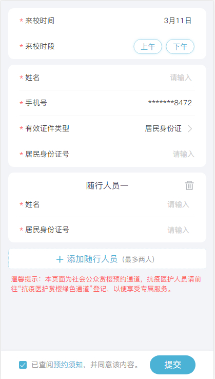 每位校友可携带两名家属入校赏樱。忘记填写家属的或只填写了一位家属需临时增加一位家属的,可在修改报名信息中补充填写。报名信息仅可修改1次。一旦报名,人员无法变动。请校友提前安排返校计划,确定好随行人员之后再填写预约报名信息。