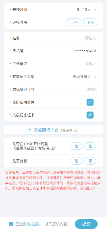 通道验证系统需提前采集校友的报名信息。当天预约可能出现数据上传不及时,未能识别校友身份信息无法入校的情况,建议至少提前1天(前一天晚上20:00前)在系统中报名预约。