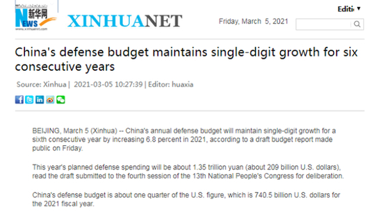 根据新华社英文3月5日报道,日前公布的一份预算草案显示,中国年度国防预算将连续第六年保持个位数增长,2021年的国防开支计划约为1.35万亿元人民币,同比增长6.8%。