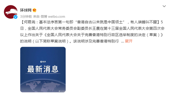5日,全国人民代表大会常务委员会副委员长王晨在第十三届全国人民代表大会第四次会议上作出关于《全国人民代表大会关于完善香港特别行政区选举制度的决定(草案)》的说明(以下简称草案说明)。该说明涉及完善香港特别行政区选举制度的总体要求、重要原则、基本思路和推进方式。香港立法会议员何君尧当天在接受《环球时报》采访时表示,“爱国者治港”并不是新名词,可惜一些反对派人士并没听进去,“基本法的序言第一句就是‘香港自古以来就是中国的领土’,可惜他们装睡永远也叫不醒”。