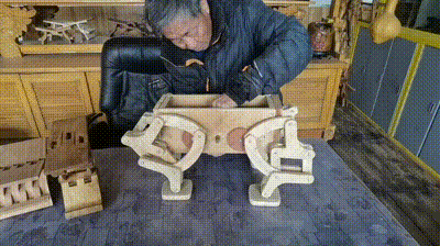 不用螺丝不用胶,他单凭一块木板扣出结构精巧的折叠桌椅。细致的木条层层叠叠,他全凭榫卯搭出稳如磐石的六角亭。会走的木牛、能动的茶盘、木架在他手中栩栩如生。