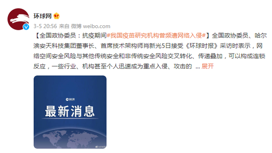 原标题:全国政协委员:抗疫期间我国疫苗研究机构曾频遭网络入侵