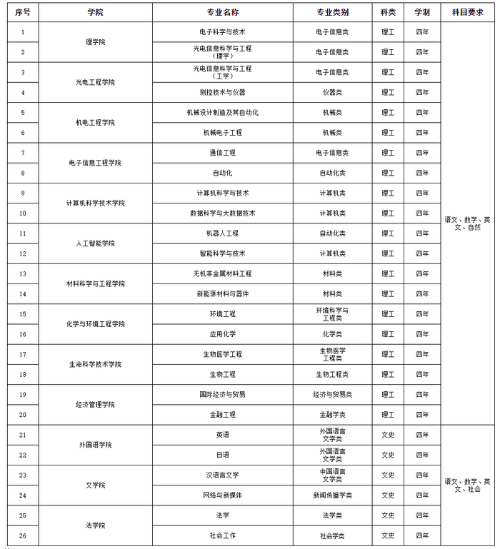 学校现有3个校区,土地面积71.8万平方米,建筑面积62.7万平方米,设有理学院、光电工程学院、机电工程学院、电子信息工程学院、计算机科学技术学院、人工智能学院、材料科学与工程学院、化学与环境工程学院、生命科学技术学院、经济管理学院、外国语学院、文学院、法学院、马克思主义学院14个教学学院,以及研究生院、军体部、远程与继续教育学院和国际教育学院等教学机构;设有7个校直属科研机构、23个院直属科研机构。现有各类学生总数31949人,其中博士研究生613人、硕士研究生4493人(含在职攻读硕士学位研究生198人)、本科生16503人、留学生221人。