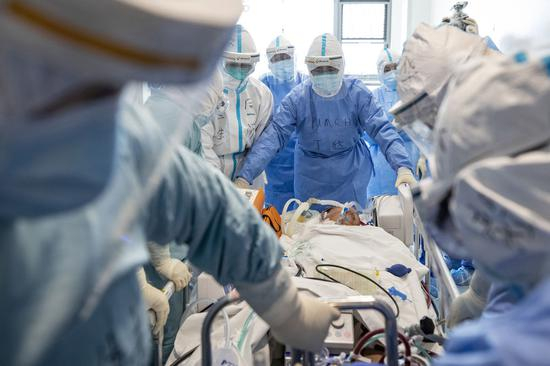 ↑2020年4月12日,北京协和医院医疗队队员与武汉同济医院医务人员共同将一名新冠肺炎危重症患者转往武汉同济医院中法新城院区ICU。在转运过程中,ECMO(人工膜肺)治疗仍在持续进行。