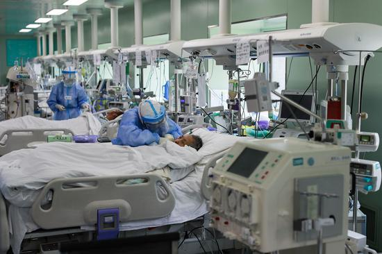 ↑2020年4月24日,在位于武汉的华中科技大学同济医学院附属协和医院西院,医务人员在护理核酸检测结果转阴的新冠肺炎病人。