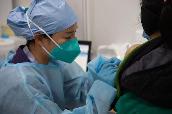 ↑2021年1月2日,在北京市朝阳区一临时接种点,医护人员为接种人员注射新冠病毒疫苗。
