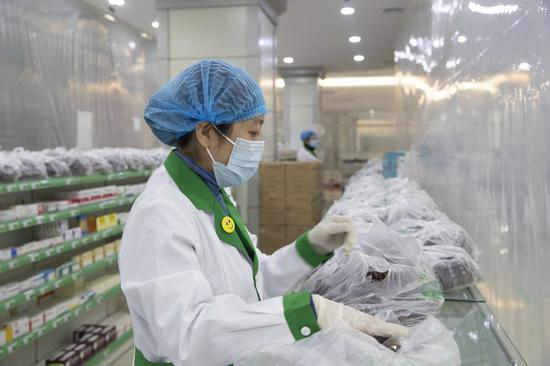↑2021年1月25日,在黑龙江绥化市泰华大药房内,工作人员打包中药汤剂。为应对新冠肺炎疫情,绥化市指定医药企业代煎中药汤剂送往市内各个集中隔离点。